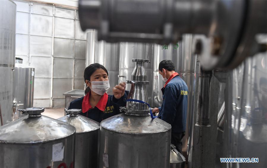 Staff members work at the East Tibet Treasure Winery Co., in Naxi Township, Mangkam County, Chamdo, southwest China's Tibet Autonomous Region, June 3, 2019. Tibetans generally serve guests highland barley wine. In a township 1,000 km from Lhasa, capital of Tibet Autonomous Region, where some people of the ethnic Naxi group live, locals welcome guests with indigenous red wine instead. The township gets its name from the ethnicity of the inhabitants -- the ethnic Naxi people, though most of whom live in Yunnan Province, Tibet's neighbor. Under the jurisdiction of Mangkam County, Chamdo, Naxi Township is the only area for the Naxi minority in Tibet. It has an average altitude of 2,600 meters and a total population of 4,557. According to the annals of Mangkam County, a French missionary traveled to the township in the 19th century, bringing grape seeds and teaching locals to make wine. Grape plantation and wine-making have taken roots in the ethnic Naxi people since then. Red wine has therefore become a local specialty product there. Almost every family in the township knows how to make red wine through traditional natural fermentation methods. Apart from drinking red wine, local residents also sell them. Without fancy and expensive packaging boxes, red wine produced by Tibet's Naxi people has gained popularity and has been playing an important role in helping locals shake off poverty in recent years. (Xinhua/Jigme Dorje)