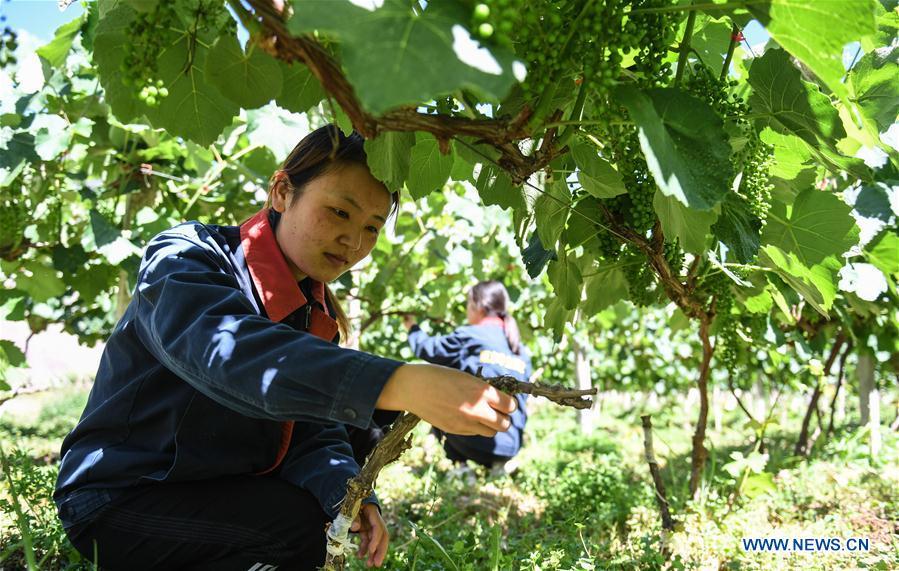Staff members trim grapevines at the East Tibet Treasure Winery Co., in Naxi Township, Mangkam County, Chamdo, southwest China's Tibet Autonomous Region, June 3, 2019. Tibetans generally serve guests highland barley wine. In a township 1,000 km from Lhasa, capital of Tibet Autonomous Region, where some people of the ethnic Naxi group live, locals welcome guests with indigenous red wine instead. The township gets its name from the ethnicity of the inhabitants -- the ethnic Naxi people, though most of whom live in Yunnan Province, Tibet's neighbor. Under the jurisdiction of Mangkam County, Chamdo, Naxi Township is the only area for the Naxi minority in Tibet. It has an average altitude of 2,600 meters and a total population of 4,557. According to the annals of Mangkam County, a French missionary traveled to the township in the 19th century, bringing grape seeds and teaching locals to make wine. Grape plantation and wine-making have taken roots in the ethnic Naxi people since then. Red wine has therefore become a local specialty product there. Almost every family in the township knows how to make red wine through traditional natural fermentation methods. Apart from drinking red wine, local residents also sell them. Without fancy and expensive packaging boxes, red wine produced by Tibet's Naxi people has gained popularity and has been playing an important role in helping locals shake off poverty in recent years. (Xinhua/Jigme Dorje)
