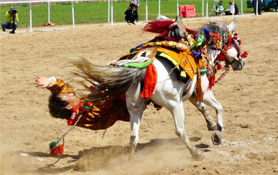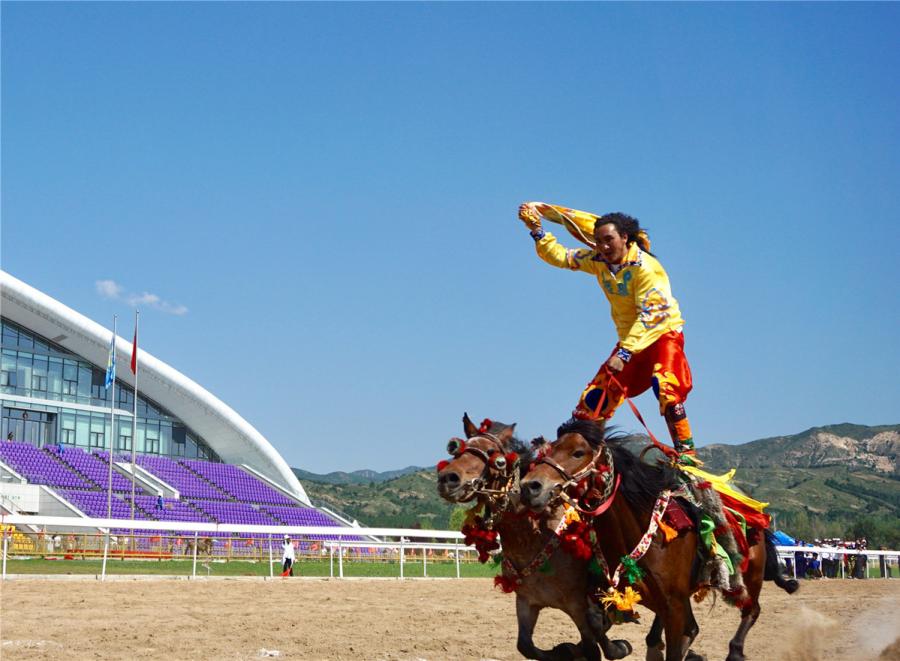 An equestrian from Qinghai province shows his skills at the 11th Traditional Games of Ethnic Minorities of China. (Photo/chinadaily.com.cn)