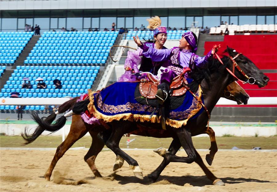 Equestrians from Xinjiang Uygur autonomous region demonstrate the traditional Khiz Khuar performance at the 11th Traditional Games of Ethnic Minorities of China in Hohhot, Inner Mongolia autonomous region. (Photo/chinadaily.com.cn)