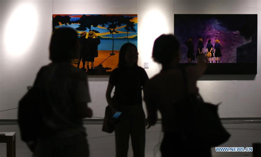 Citizens view art works at an art museum in Binhai New Area, north China's Tianjin, July 16, 2019. To further enrich citizens' night-time life, Tianjin Binhai New Area authority of culture and tourism approves to extend public facilities' running time including library, museum and art museum in the area. (Xinhua/Yue Yuewei)
