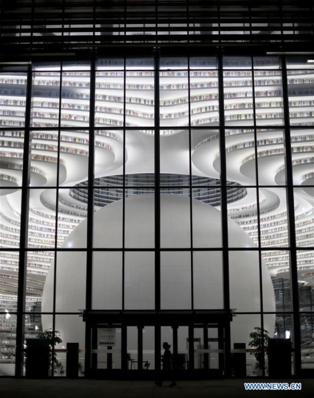 Photo taken on July 16, 2019 shows the night view of a library in Binhai New Area, north China's Tianjin. To further enrich citizens' night-time life, Tianjin Binhai New Area authority of culture and tourism approves to extend public facilities' running time including library, museum and art museum in the area. (Xinhua/Yue Yuewei)