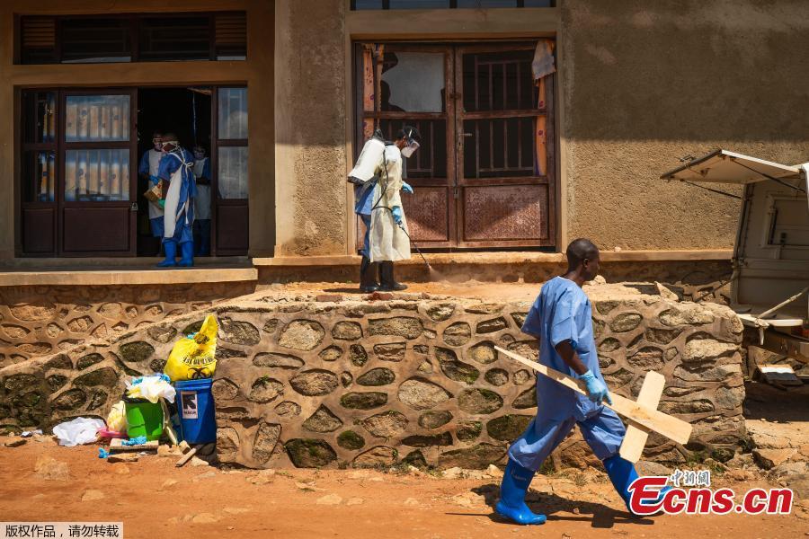 In this photograph taken Sunday July 14, 2019, a morgue employee walks with a cross past others disinfecting the entrance to the morgue in Beni, Congo DRC. The head of the World Health Organization is convening a meeting of experts Wednesday July 17, 2019 to decide whether the Ebola outbreak should be declared an international emergency after spreading to eastern Congo's biggest city, Goma, this week. More than 1,600 people in eastern Congo have died as the virus has spread in areas too dangerous for health teams to access.(Photo/Agencies)