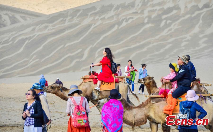 Large numbers of tourists are visiting Crescent Spring and Mingsha Mountain scenic spot in the Gobi desert in Dunhuang City, Northwest China's Gansu Province in July, the start of the peak travel season, even riding camels that can form a queue 2 kilometers long. With of a vast expanse of sand dunes, Mingsha Mountain, or "Singing Sand," is famous for its desert scenery and the mysterious sound made by wind blowing over its surface. The area’s blue sky, white clouds and rolling sands are particularly appealing to visitors. (Photo: China News Service/Wang Binyin)
