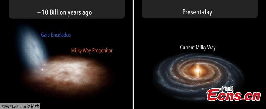 The merger of the Milky Way progenitor galaxy and the dwarf galaxy Gaia-Enceladus roughly 10 billion years ago (L) and the current appearance of the Milky Way galaxy (R) are shown in this artist's conception released by Instituto de Astrofisica de Canarias in La Laguna, Spain on July 22, 2019. (Photo/Agencies)
