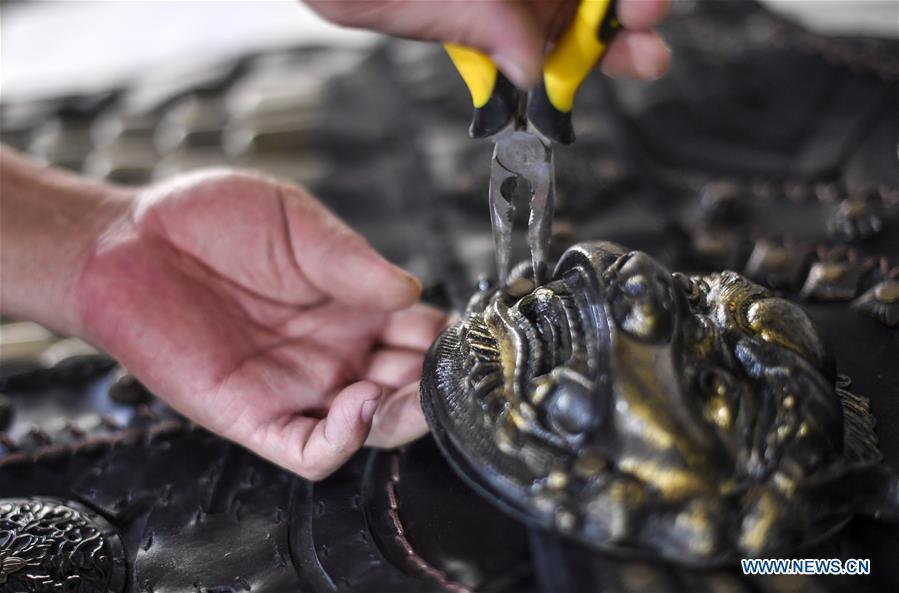 Yang Guangquan assembles an armor at his studio in Changchun, capital of northeast China's Jilin Province, July 22, 2019. Yang Guangquan, a 50-year-old artisan obsessed with handicrafts, learned forging iron when he was young. He decided to make metal handicrafts in 2013, with application of old blacksmith techniques to make new creations. After several years of running his studio, Yang has gained customer's affection for his works. He also set up a cooperative platform to develop market for handicrafts, and nearly 100 artisans involved in paper cutting, knife painting and wood carving benefit from Yang's platform. (Xinhua/Xu Chang)