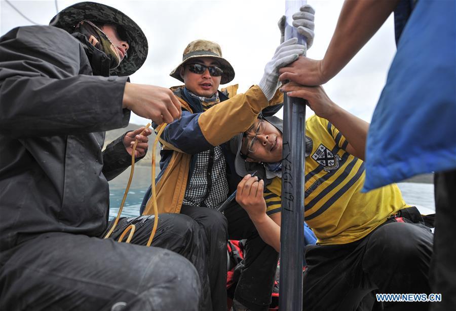 Members of a Chinese scientific expedition team mark the sediment core of Lake Yamzhog Yumco in Nanggarze County of Shannan, southwest China's Tibet Autonomous Region, July 22, 2019. Chinese scientists are working on a survey to measure the depth of a major lake in southwest China's Tibet Autonomous Region, sources with the Chinese Academy of Sciences (CAS) said Tuesday. Lake Yamzhog Yumco with an area of about 590 square km is located in Nanggarze County in the city of Shannan. Yamzhog Yumco along with Lake Namtso and Lake Manasarovar are regarded as the three holy lakes of Tibet. (Xinhua/Jigme Dorje)