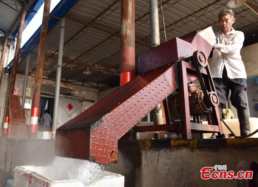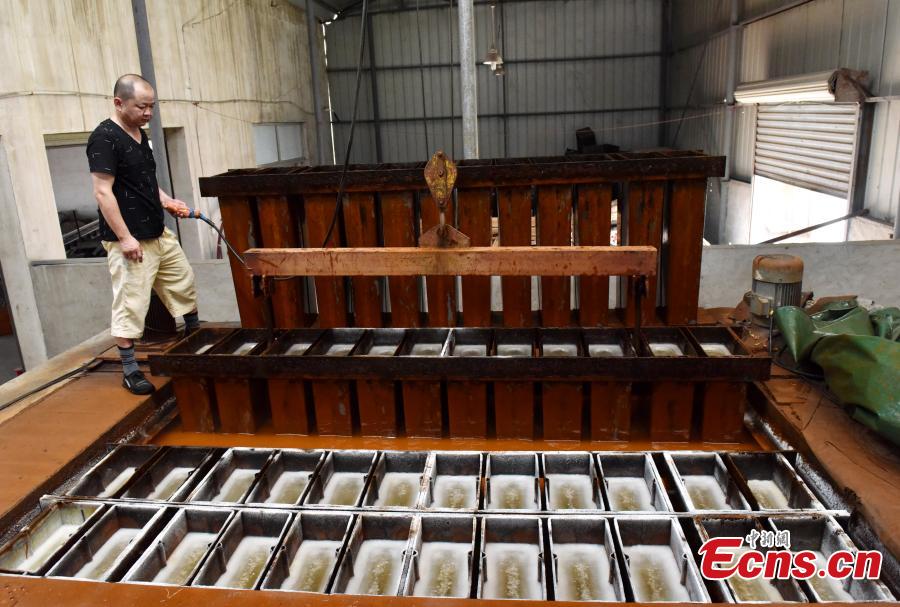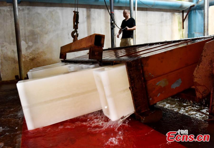 Ice blocks are manufactured in a workshop in Chaohu City, East China’s Anhui Province, July 22, 2019. The city has been hit by high temperatures, which has created a spike in demand for ice blocks. (Photo: China News Service/Ma Fengcheng)