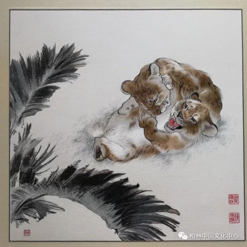 An embroidery work of big cats on display at the China Cultural Center in Berlin, July 5, 2019. (Photo/Chinaculture.org)