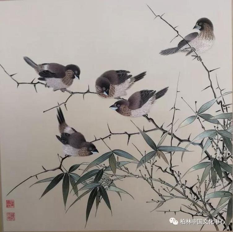 An embroidery work of birds on display at the China Cultural Center in Berlin, July 5, 2019. (Photo/Chinaculture.org)