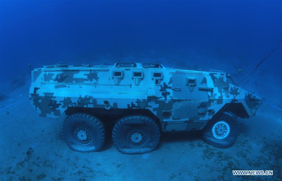 Handout photo obtained on July 23, 2019 shows a Jordanian Armed Forces armoured vehicle lying on the seabed of the Red Sea as part of a new underwater military museum off the coast of the southern port city of Aqaba, Jordan. The museum is built by Aqaba Special Economic Zone to attract more tourists in summer, (Aqaba Special Economic Zone/Handout via Xinhua)