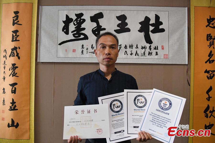 Nong Junning, 47, a martial arts enthusiast, displays some of his unusual dagger skills in Nanning City, South China’s Guangxi Zhuang Autonomous Region, July 24, 2019. Nong inherited the stunts traditionally practised by the Zhuang people, and paper aircrafts and chopsticks are just some of the ordinary items he can turn into dagger-like weapons. In 2018, he took one minute to throw 13 paper aircrafts two metres into watermelons, setting a new Guinness World Record. Yu said his dream is to continue to promote the martial arts tradition of the Zhuang people. (Photo: China News Service/Yu Jing)