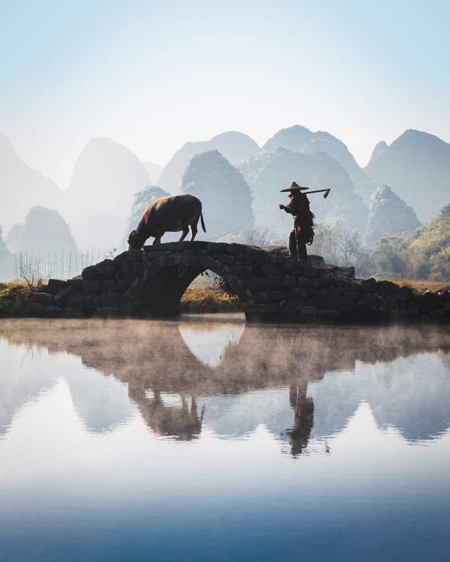 Two farmers lead an ox in Jord Hammond's photo of the Yangjiaxi scenic area of Puxia county, East China's Fujian province.(Photo provided to chinadaily.com.cn)
