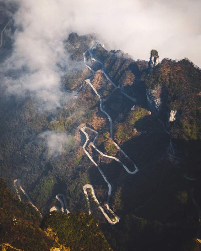 A road snakes across the mountain landscape in this aerial view of Tianmen Mountain in Zhnagjiajie, Central China's Hunan province, by Jord Hammond. (Photo provided to chinadaily.com.cn)