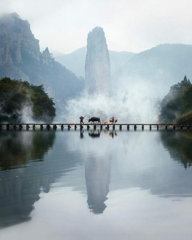 Jord Hammond's photo shows farmers crossing a bridge with their animals in the Xiandu scenic area of Jinyun county, East China's Zhejiang province. (Photo provided to chinadaily.com.cn)
