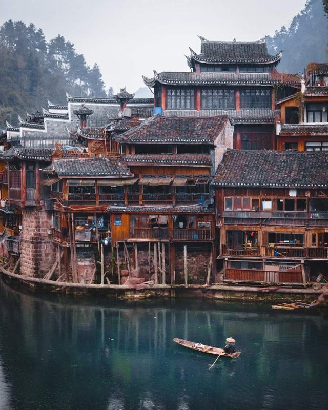 Jord Hammond's photo shows a man rowing a boat on the Tuojiang River against a backdrop of buildings in Fenghuang county, Central China's Hunan province. (Photo provided to chinadaily.com.cn)