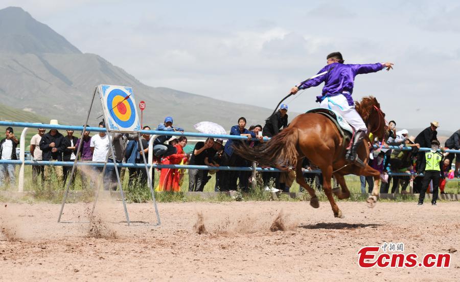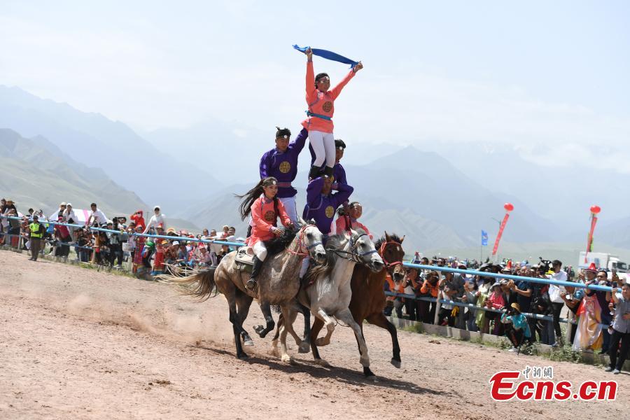 Riders perform a stunt on horseback during a horse competition in Sunan Yugur Autonomous County, Zhangye City, Northwest China’s Gansu Province, July 27, 2019. More than 200 horses forming 16 teams participated in the competition that included speed races and equestrian shows. (Photo: China News Service/Yang Yanmin)