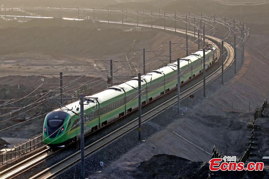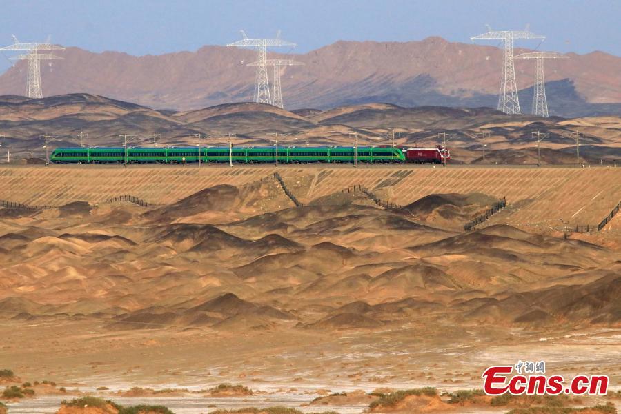 A Fuxing bullet train crosses the Hongliu River Bridge between the border of Gansu Province and Xinjiang Uygur Autonomous Region, July 28, 2019. It is one of the first two Fuxing bullet trains to be used in Xinjiang. Entirely designed and manufactured in China, the Fuxing, or Rejuvenation, trains are more spacious and energy-efficient, with a longer service life and better reliability than previous models. (Photo: China News Service/Cai Zengle)