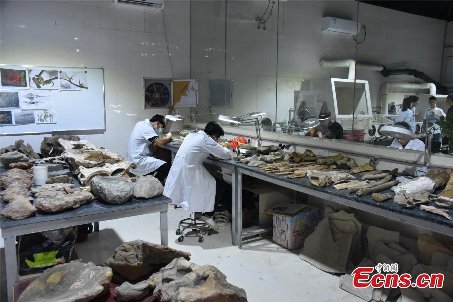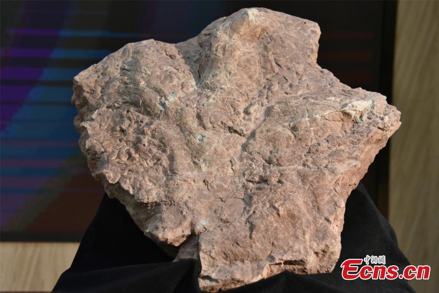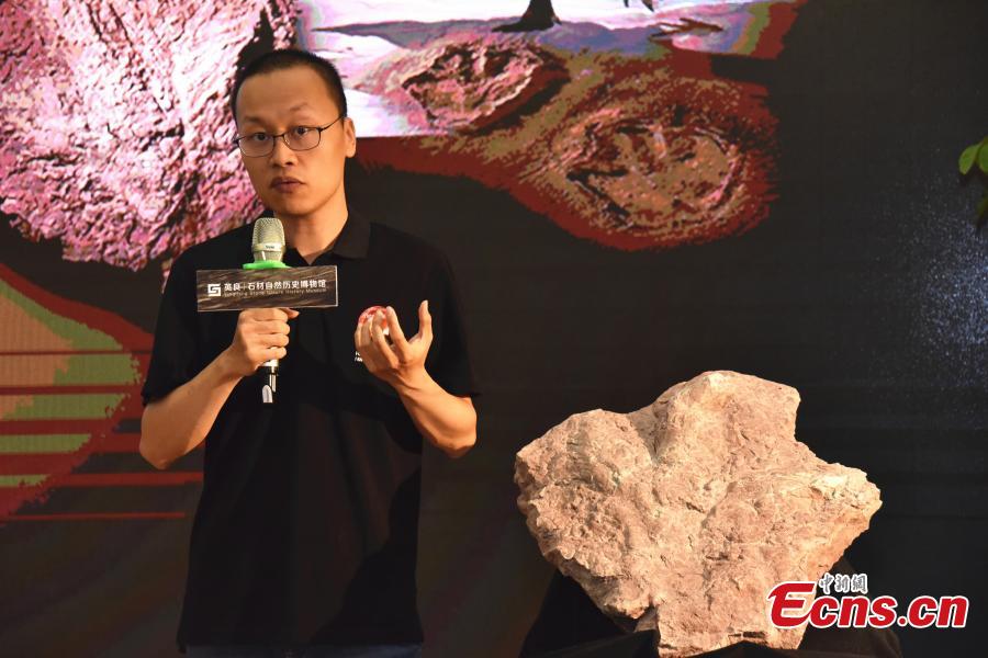 Xing Lida, an associate professor at the China University of Geosciences, Beijing introduces the fossil of a dinosaur footprint in Shuitou Town, Quanzhou City, East China’s Fujian Province, July 29, 2019. Xing said the footprint measures 58 centimeters in length and belonged to a Tyrannosaurus. It’s the first such discovery in Asia. The fossil will become part of a collection at the Yingliang Global Stone Museum. (Photo: China News Service/Chen Longshan)