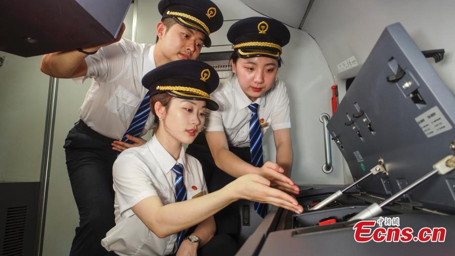 Instructor Shuai Yi trains China’s first batch of female bullet train drivers on the route from Nanchang City, East China’s Jiangxi Province to Xiamen City in Fujian Province, July 29, 2019. The courses includes driving regulations, skills, protocols and etiquette. The average age of the female train drivers is 24 years. (Photo: China News Service/Bao Gansheng)