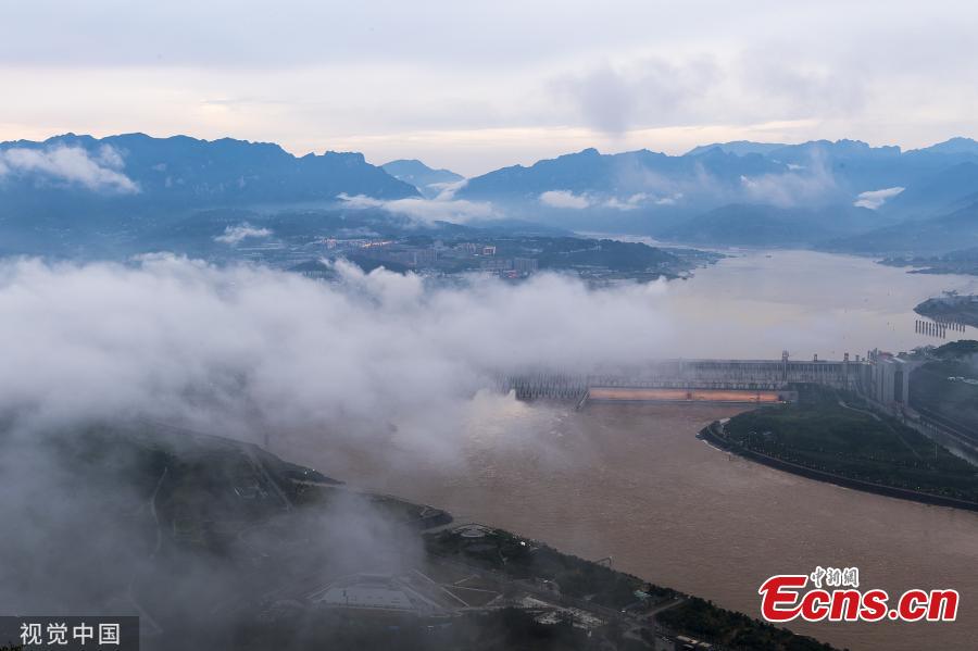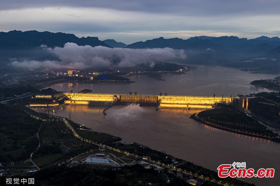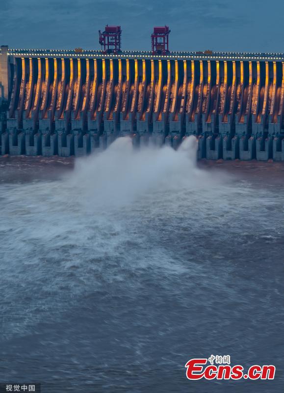 Water is discharged from the Three Gorges Dam, a gigantic hydropower project on the Yangtze River, in Yichang City, Central China's Hubei Province, July 30, 2019. The discharge of water is in response to potential flood risk in the upper reaches following days of rainfall. (Photo/VCG)