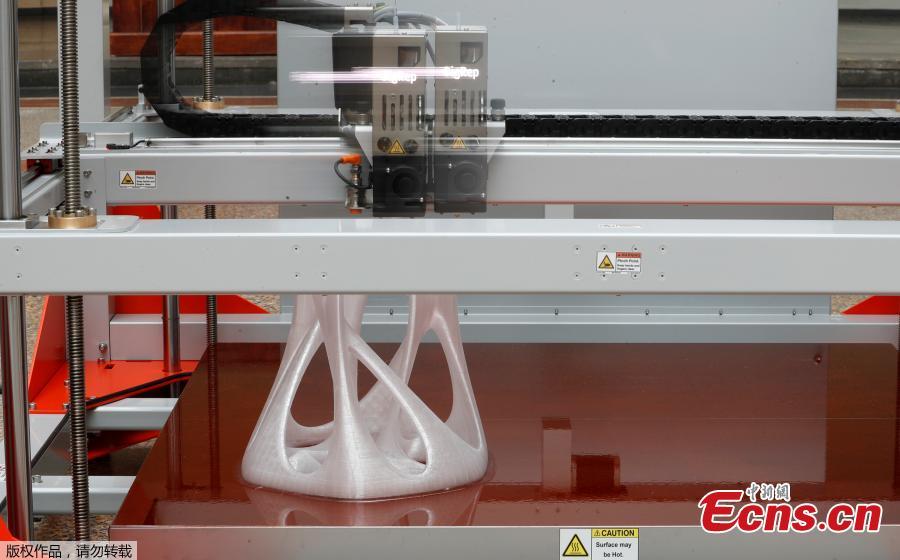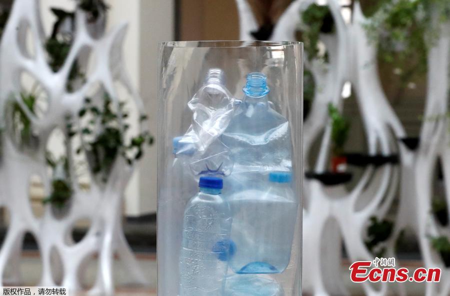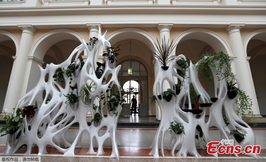 The world's first fully 3D-printed urban biodiversity habitat installation, the "Genesis Eco Screen", manufactured with a large-format 3D printer by BigRep out of PET bottles recycling is presented during a media event in Berlin, Germany, July 31, 2019. The Genesis Eco Screen embedded drainage system for plants and insects habitat. (Photo/Agencies)