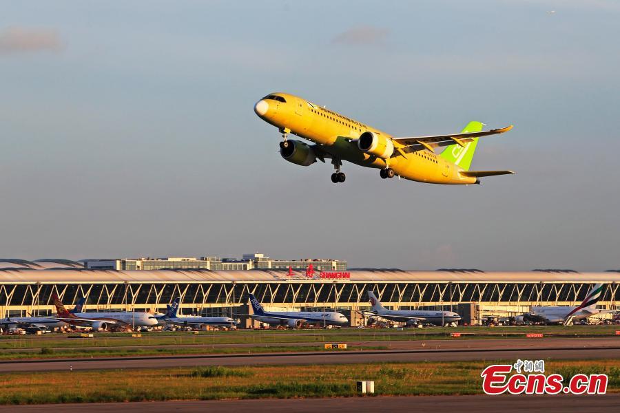A photo taken on Aug 1 shows a C919 jet, type 104, taking off from a runway at Shanghai Pudong International Airport. The 104 aircraft departed the airport at 5:32 am on Thursday morning and completed its first flight in one hour and 25 minutes. Four C919 jets ? the 101, 102, 103 and 104 ? have completed testing, while another two new C919 jets, the 105 and 106, will complete their test flights later this year. (Photo: China News Service/Yin Liqin)