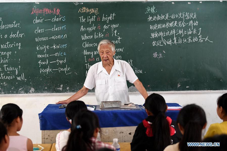 Ye Lianping gives an English lesson at the classroom of the "home for left-behind children" in Buchen Village of Hexian County, east China's Anhui Province, July 31, 2019. Ye Lianping, a 92-year-old retired teacher in Buchen Village of Hexian County, set up the "home for left-behind children" in 2000 to teach them English lessons for free. As most of the young people work far away, elders and children are left behind in the village. With no child himself, Ye lives with his wife in a bungalow built 30 years ago, where he offers those children who live far away with food and living place. In the past 19 years, Ye has helped more than 1,000 children on his own. Moved by his deeds, volunteers across the country support him in the recent years, and he is also given many honors and awards. However, Ye's will is to run against the time, which he thinks he is really short of to take care of those left-behind children. (Xinhua/Liu Junxi)