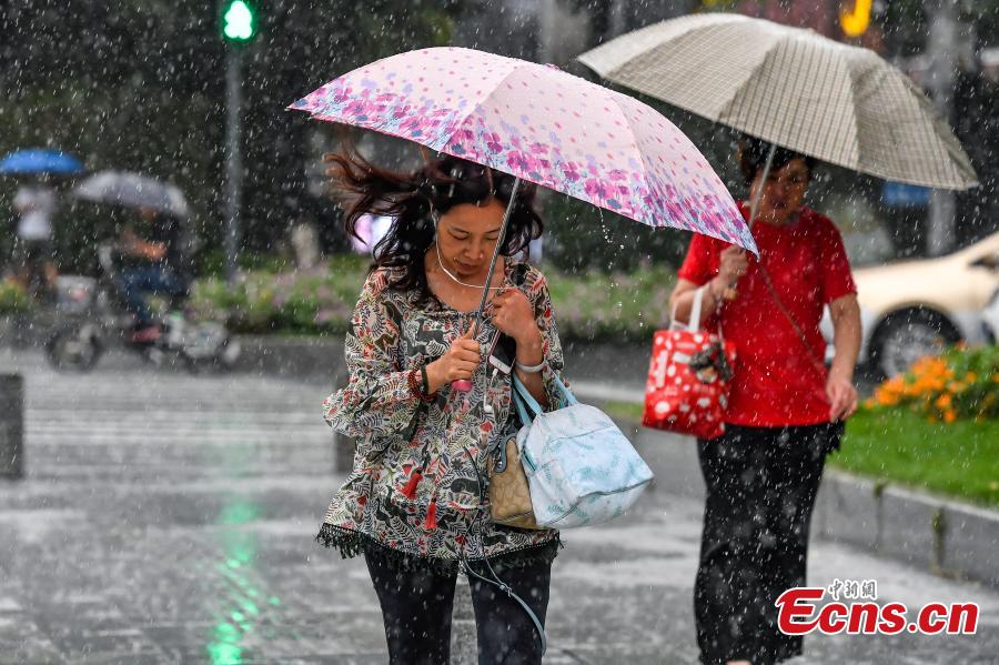 People walk in rain in Guangzhou, South China’s Guangdong province, August 1, 2019. The city issued a rainstorm warning on Thursday after Typhoon Wipha lands on costal area of the province and brings rain and strong winds. (Photo: China News Service/Chen Jiwen)