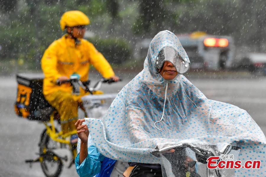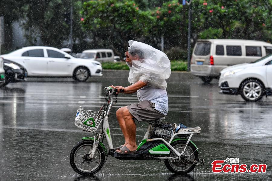 People ride bikes in rain in Guangzhou, South China’s Guangdong province, August 1, 2019. The city issued a rainstorm warning on Thursday after Typhoon Wipha lands on costal area of the province and brings rain and strong winds. (Photo: China News Service/Chen Jiwen)