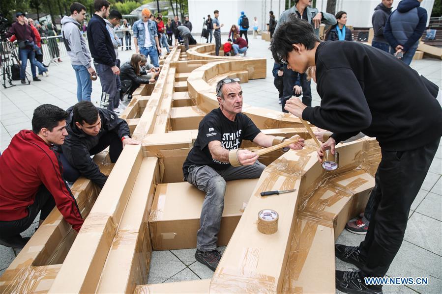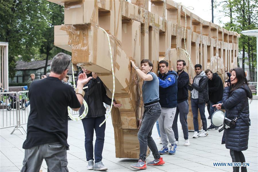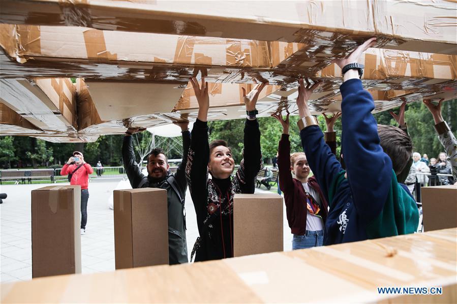 Volunteers assemble a bridge made of cardboard and duct tape in Ostankino park in Moscow, Russia, on Aug. 1, 2019. A 18-meter-long flying bridge made of cardboard and duct tape was assembled and installed in Ostankino park of Moscow on Thursday. The bridge was lifted into the air with the help of three balloons filled with helium. (Photo by Maxim Chernavsky/Xinhua)