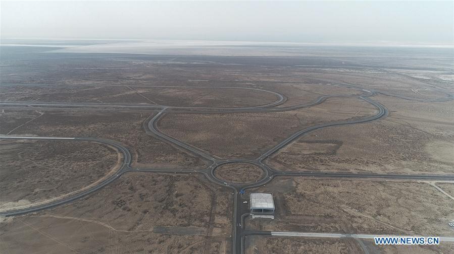 Aerial photo taken on July 30, 2019 shows the vehicle testing field funded by SAIC Volkswagen in Turpan, northwest China's Xinjiang Uygur Autonomous Region. A vehicle testing field has been put into service in Turpan, a city known as "the land of fire" in northwest China's Xinjiang Uygur Autonomous Region on Wednesday. This vehicle testing field occupies an area of 23.35 million square meters, equivalent to the size of more than 3,200 football fields. It is funded by SAIC Volkswagen, aiming to test their products including petrol-based vehicles, new energy vehicles and automotive parts under extremely dry and hot conditions. (Photo by Han Xinliang/Xinhua)