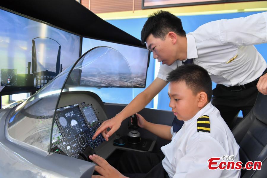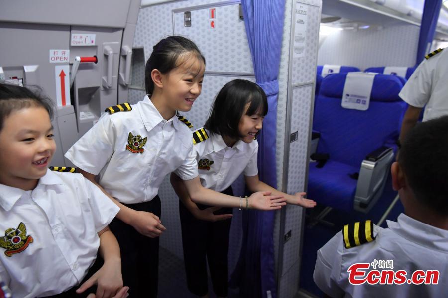 Children in a summer camp learn about aviation and flight etiquette under the guidance of pilots in Kunming City, Southwest China’s Yunnan Province, Aug. 1, 2019. (Photo: China News Service/Ren Dong)