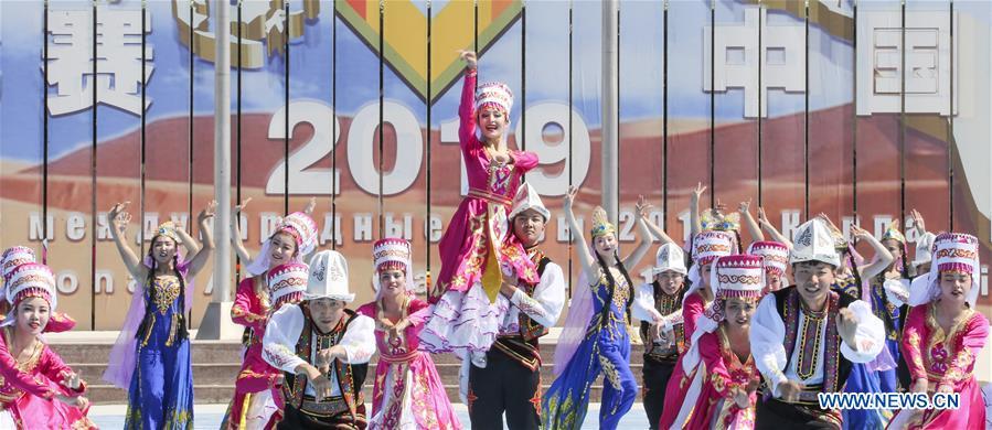 Dancers perform during the opening ceremony for the competitions hosted by China as part of the International Army Games 2019 in Korla, northwest China's Xinjiang Uygur Autonomous Region, Aug. 3, 2019. The opening ceremony for the competitions hosted by China as part of the International Army Games 2019 was held on Saturday in Korla, northwest China's Xinjiang Uygur Autonomous Region. The Chinese army will host four contests in areas such as infantry combat vehicles and weapon repair. Teams coming from 12 countries in Asia, Europe, Africa and South America will take part. (Photo by Liu Xiaodong/Xinhua)