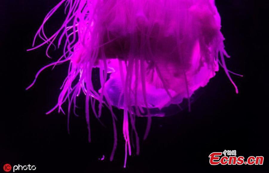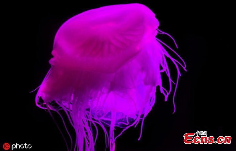 An extremely rare Pink Meanie jellyfish on display at the Two Oceans Aquarium in Cape Town, South Africa on August 2, 2019. The jellyfish was discovered during a nightlight jellyfish dive by the Two Oceans Aquarium collections team in the waters around Robben Island and in Cape Town Harbour. The Mexican pink meanie (Drymonema larsoni) was only discovered in the year of 2000. (Photo/IC)