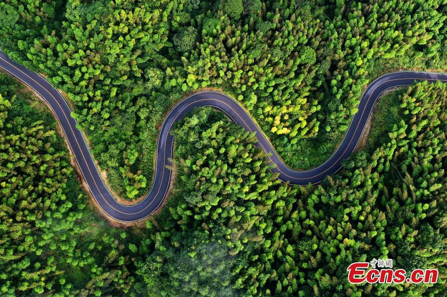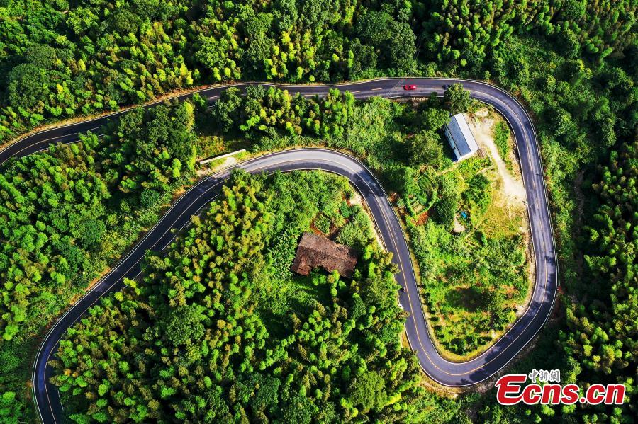 Photo taken from a drone shows a road crossing the lush forest of Baizhang Mountain in Fengxin County, East China’s Jiangxi Province, Aug. 4, 2019. Some vacationers drive the mountain road as a summer retreat. (Photo: China News Service/Liu Zhankun)