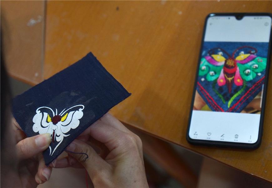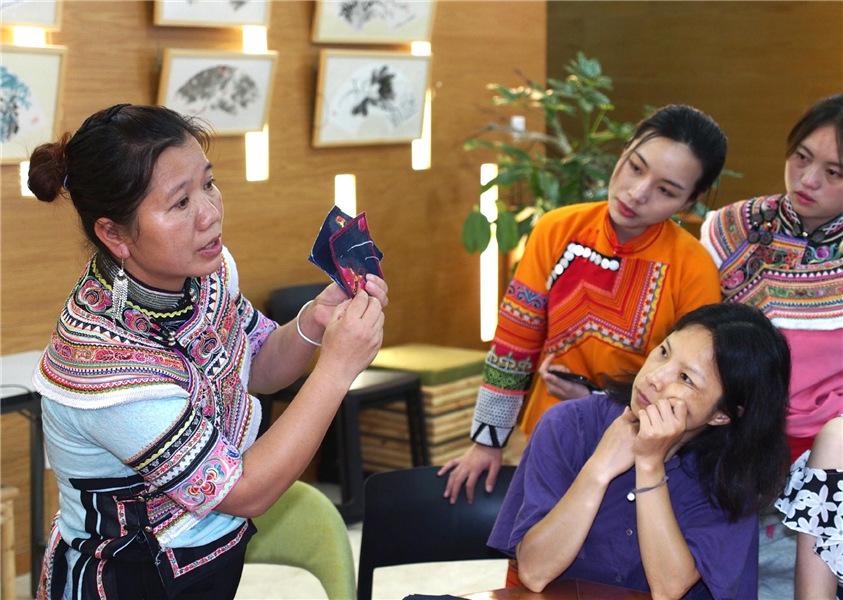 Workshop on traditional embroidery of Yi people from Southwest China has become a new attraction for Shanghai locals. Ma Suying, one of the volunteers from Yunnan Province, offers practice lessons for embroidery lovers. Since 2017, Ma has been working with local volunteer organizations, which train embroiders and also produce handicrafts for urban dwellers.