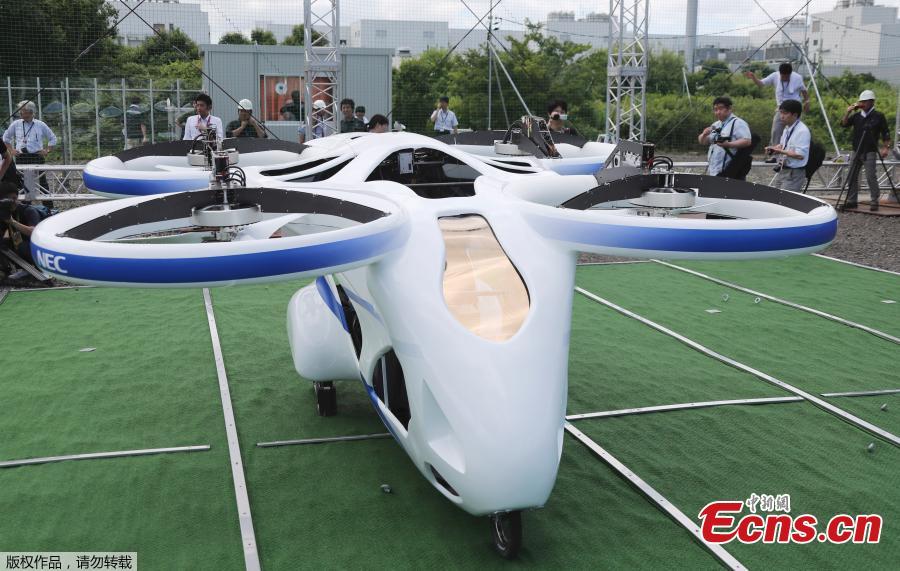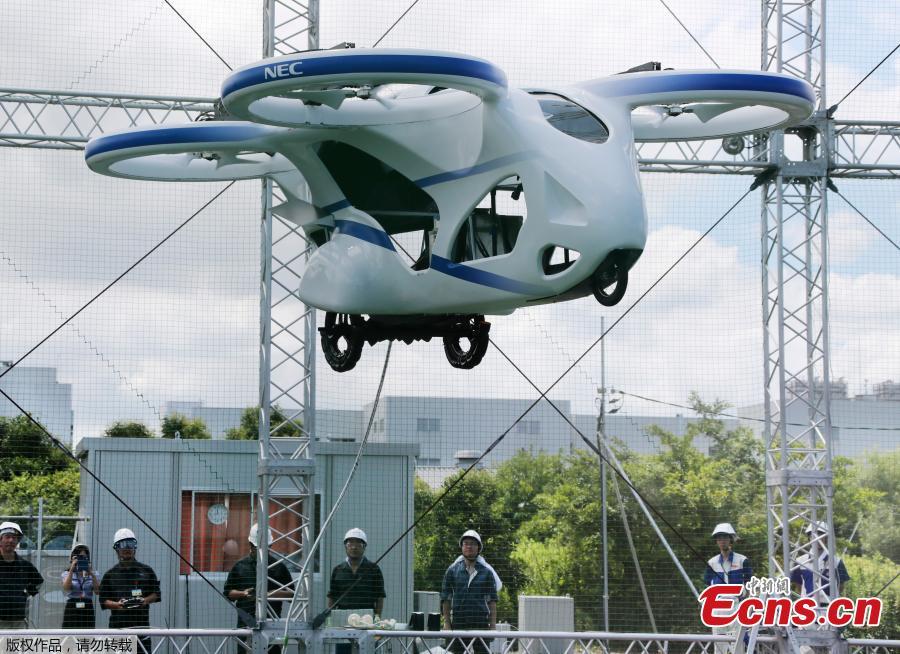 It was caged and only hovered for about a minute, but it flew: a new flying car. Made by NEC Corp., the vehicle is essentially a large drone with four propellers that’s capable of carrying people. The Japanese electronics maker demonstrated the machine, flying without a passenger, at a Tokyo suburb on Monday. Powered by a battery, it rose briefly to about 3 meters above the ground before settling down again. (Photo/Agencies)
