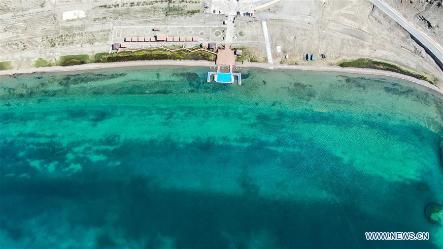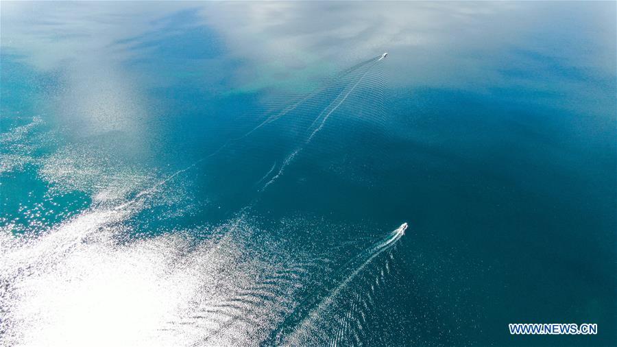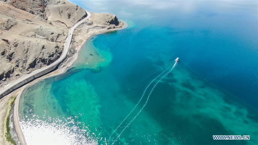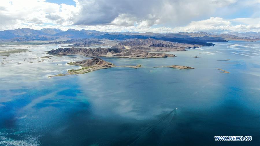 Aerial photo taken on Aug. 3, 2019 shows the Banggong Co in Ngari Prefecture, southwest China's Tibet Autonomous Region. (Xinhua/Jigme Dorje)