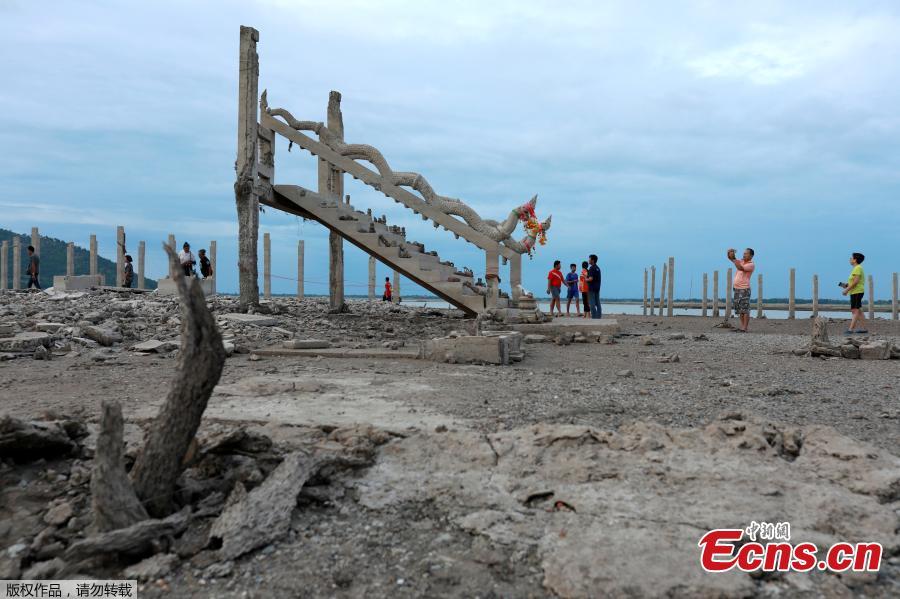 People walk and take pictures at the ruins of a Buddhist temple which has resurfaced in a dried-up dam due to drought, in Lopburi, Thailand August 1, 2019. (Photo/Agencies)