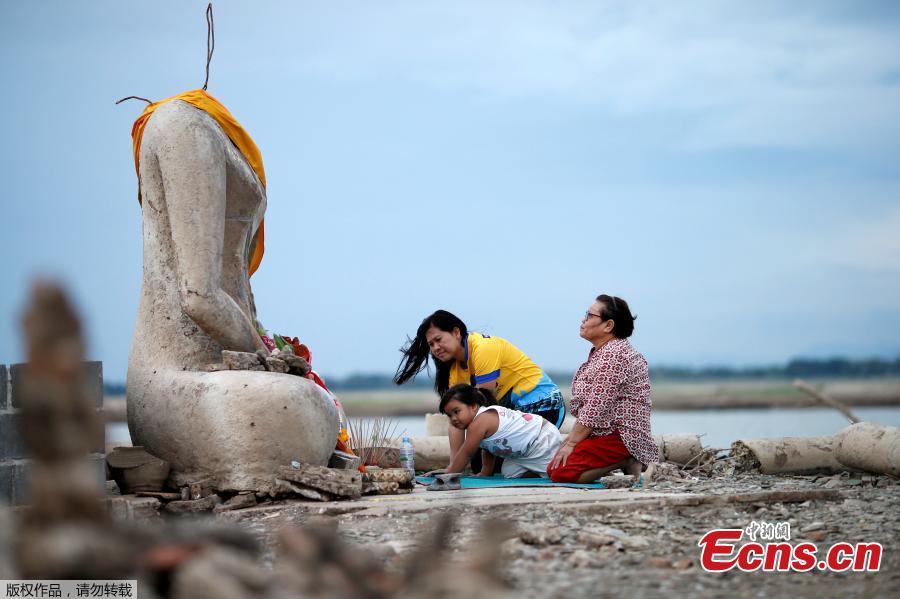 A family prays near the ruins of a headless Buddha statue, which has resurfaced in a dried-up dam due to drought, in Lopburi, Thailand August 1, 2019.(Photo/Agencies)