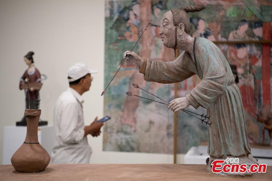 An exhibition of paintings and sculptures featuring various sporting activities depicted in ancient murals is held at the Taiyuan Art Gallery in Taiyuan City, Shanxi Province, Aug. 6, 2019. Some of the ancient activities bear a resemblance to modern-day sports, including golf and darts. (Photo: China News Service/Wei Liang)