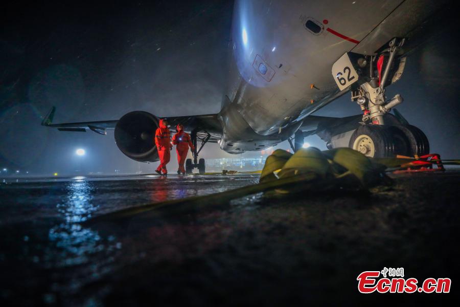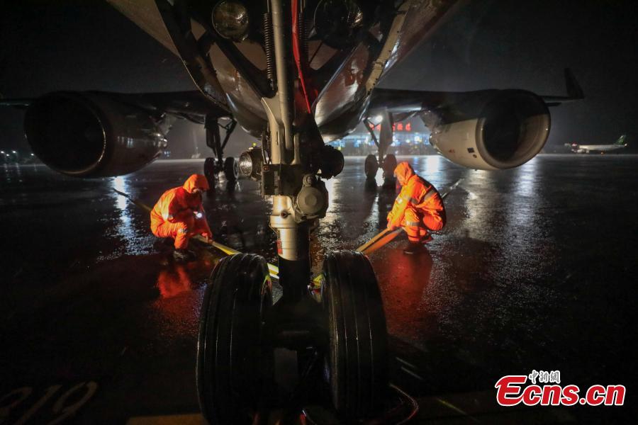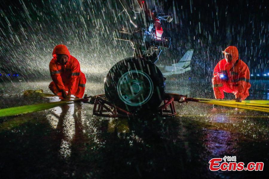 Emergency workers secure an airplane at the Yangzhou Taizhou International Airport in east China’s Jiangsu Province, Aug. 11, 2019. As of 5 p.m. Sunday, Typhoon Lekima had left 6.51 million people impacted in the provinces of Zhejiang, Jiangsu, Anhui, Shandong and Fujian as well as the city of Shanghai, according to the Ministry of Emergency Management. (Photo: China News Service/Zhuang Jianxiang)