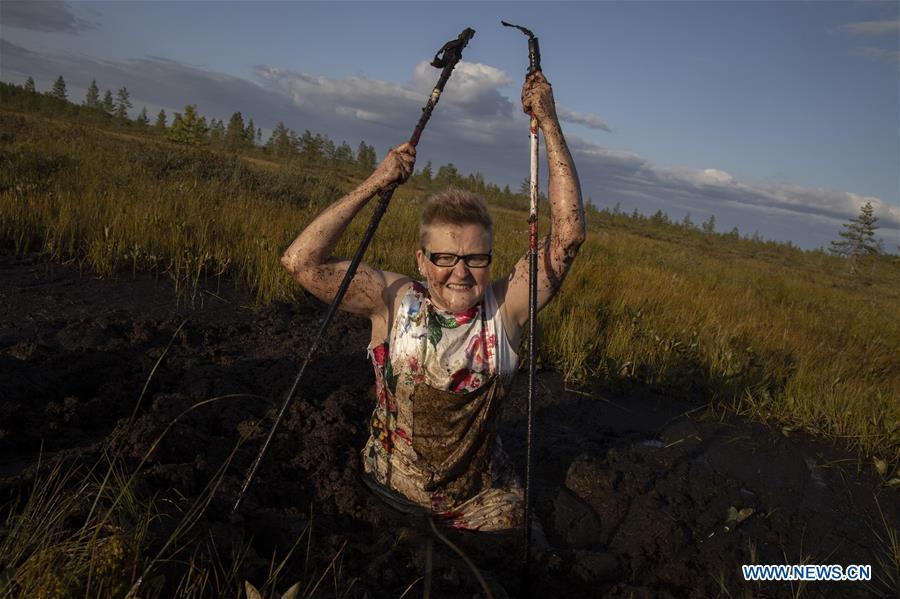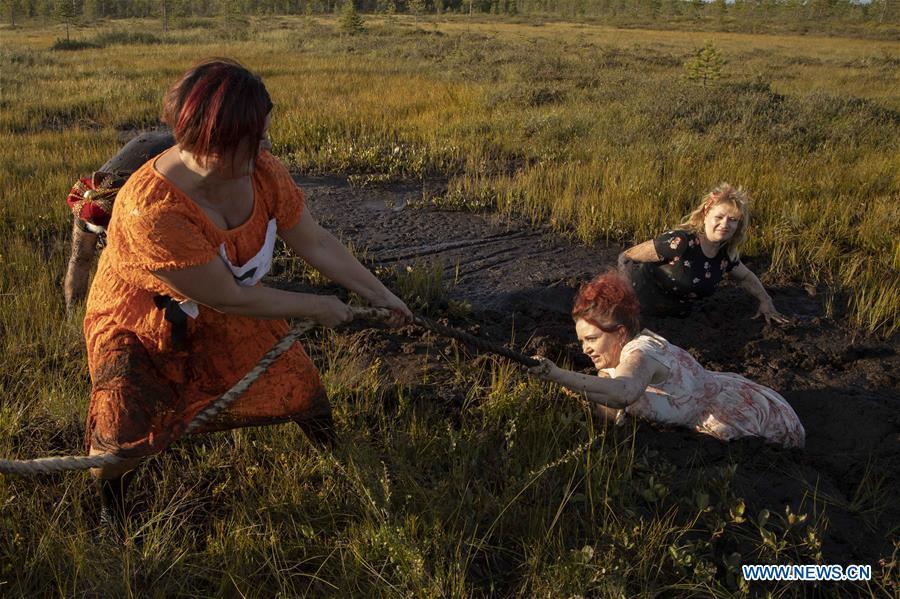 People take part in floral-dress high-heel swamp skiing competition in Pudasjarvi, northern Finland on Aug. 10, 2019. Contestants skied through a 30-meter swamp, which is more physically demanding than skiing on snow. The competition was launched 14 years ago, designed to bring joy in a humorous way. (Photo by Matti Matikainen/Xinhua)