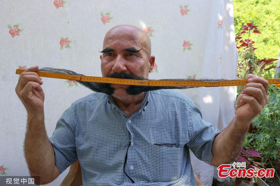 Huseyin Gunduz shows his mustache. Cousins Mehmet and Huseyin, who have not cut their mustaches for 20 years and go on with their lives with 80 cm mustache, shape their mustaches with hair dryer and hair spray. (Photo/VCG)