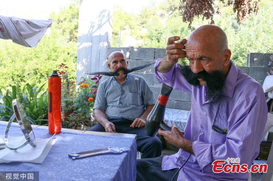 Mehmet Kurtulan (L) and Huseyin Gunduz (R) pose for a photo in Turkey on August 12, 2019. Cousins Mehmet and Huseyin, who have not cut their mustaches for 20 years and go on with their lives with 80 cm mustache, shape their mustaches with hair dryer and hair spray. (Photo/VCG)