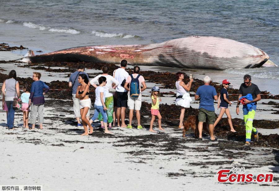 People look at a dead fin whale lying on a beach in Penmarc'h, western France on August 13, 2019 . The 13-metre long whale washed up on the beach after it died at sea. Fin whales are the world's second largest mamals after the blue whale.(Photo/Agencies)
