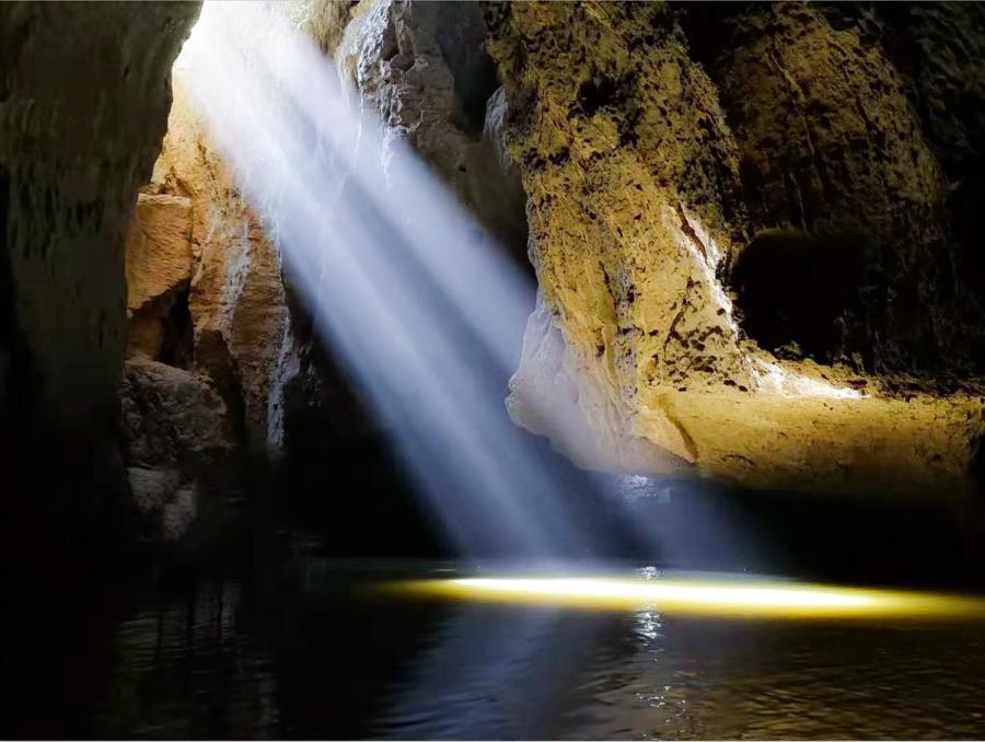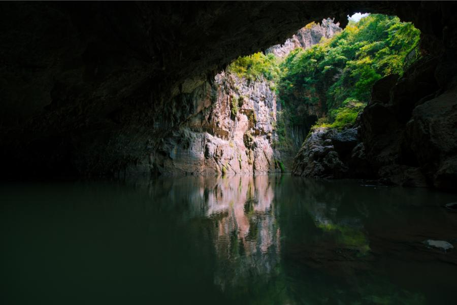 Jiudongtian, which means "nine caves in the sky" in Chinese, covers an area of 80 square kilometers. It features nine huge caves dotting a six-kilometer-long underground stream. The sky is sometimes hidden and sometimes seen from the stream.