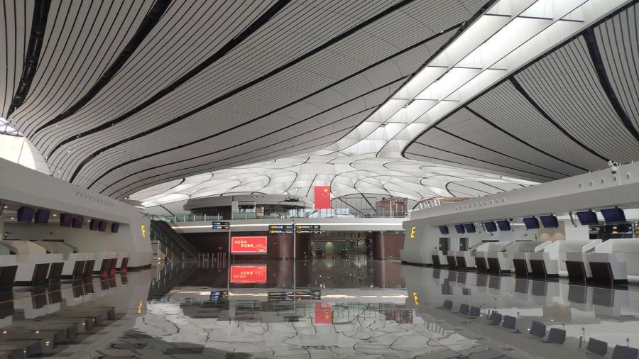 A Chinese national flag hangs on the ceiling at the center of the Beijing Daxing International Airport. (Photo/chinadaily.com.cn)