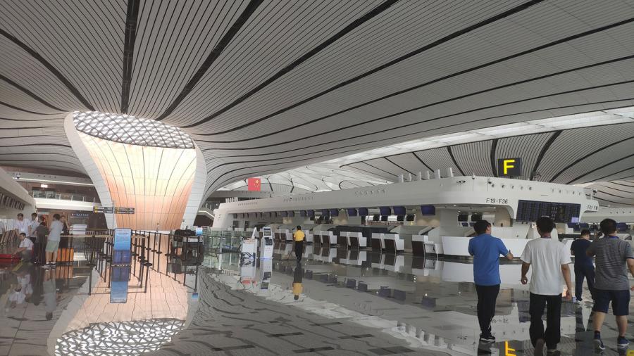 A photo taken on Aug. 5 shows the No 4 gate to the single terminal of the Beijing Daxing International Airport, the largest of its kind, for international departures and regional departures (Hong Kong/Macao/Taiwan), in the Daxing district of Beijing. (Photo/chinadaily.com.cn)